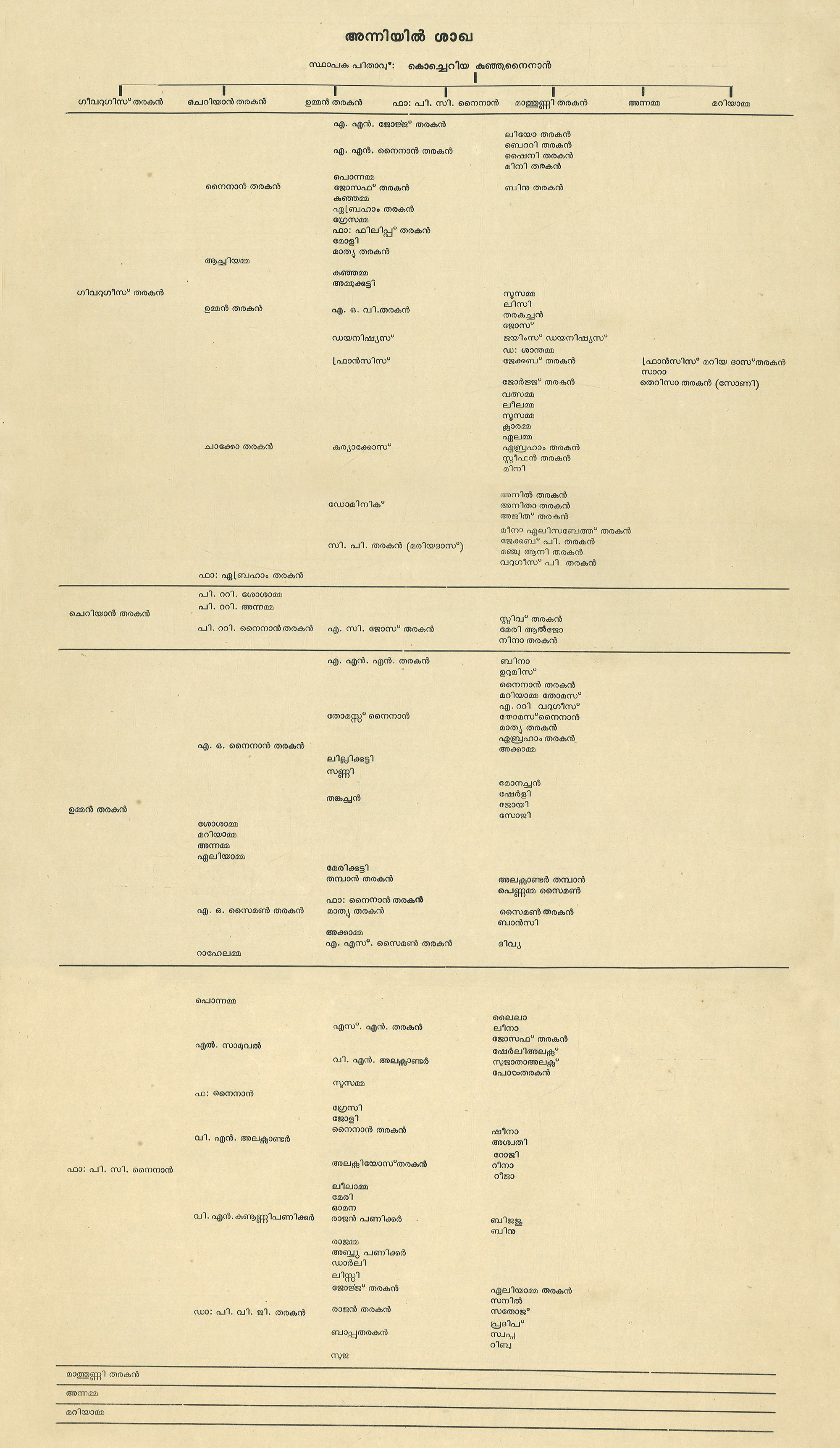 മൂത്തമകൻ 1. ഗീവറുഗീസ്തരകൻ (മൂത്തകുഞ്ഞ്) ഇരവിപേരൂർ ശങ്കരമംഗലത്ത് ആച്ചിയമ്മയെ വിവാഹം ചെയ്തു. രണ്ടാമത്തെ മകൻ ചെറിയാൻതരകൻ (പാപ്പിയച്ചൻ) ചാത്തന്നൂർ മഞ്ചാടിവിളാകത്ത് മറിയാമ്മയെ വിവാഹം ചെയ്തു. മൂന്നാമത്തെ മകൻ ഉമ്മൻതരകൻ (കൊച്ചുമ്മൻ) ആയിരൂർ കുരുടാമണ്ണിൽ അക്കാമ്മയെ വിവാഹം ചെയ്തു. നാലാമത്തെ മകൻ ഫാ: പി. സി നൈനാൻ (വീട്ടിനാലച്ചൻ) മാവേലിക്കര വഴുവാടിയിൽ വീട്ടിനാൽ പണിക്കരുടെ മകൾ ശോശാമ്മയെ വിവാഹംകഴിച്ചു. അഞ്ചാമത്തെ മകൻ മാത്തുണ്ണിതരകൻ (കൊച്ചുകുഞ്ഞ്) മാവേലിക്കരയ്ക്കടുത്തുള്ള ഞാറയ്ക്കാട്ടു കുടുംബത്തിൽ സാറാമ്മയെ വിവാഹം ചെയ്തു.